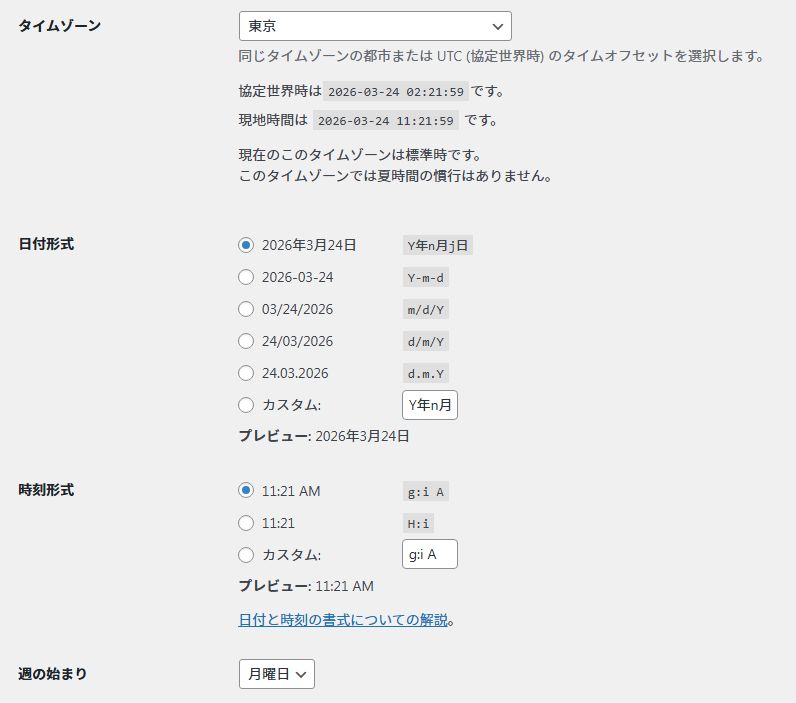 同じ画面の下の方に「タイムゾーン」があります。日本向けのサイトであれば「東京」になっているか確認してください。これがズレていると、後々「予約投稿」機能を使った時に、指定した時間に記事が公開されないというトラブルが起きます。