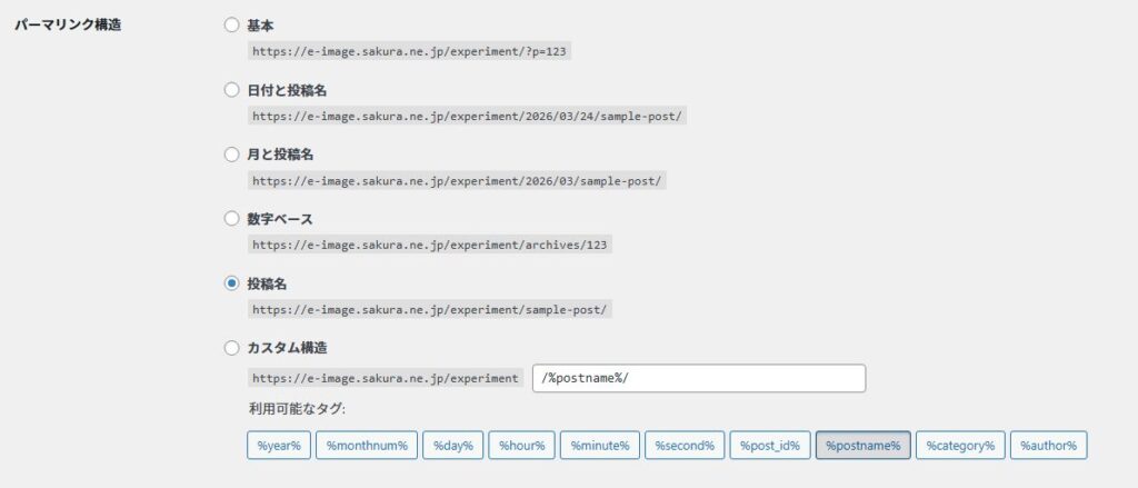 特別な理由がない限りは、ここを「投稿名(/%postname%/)」にしましょう。